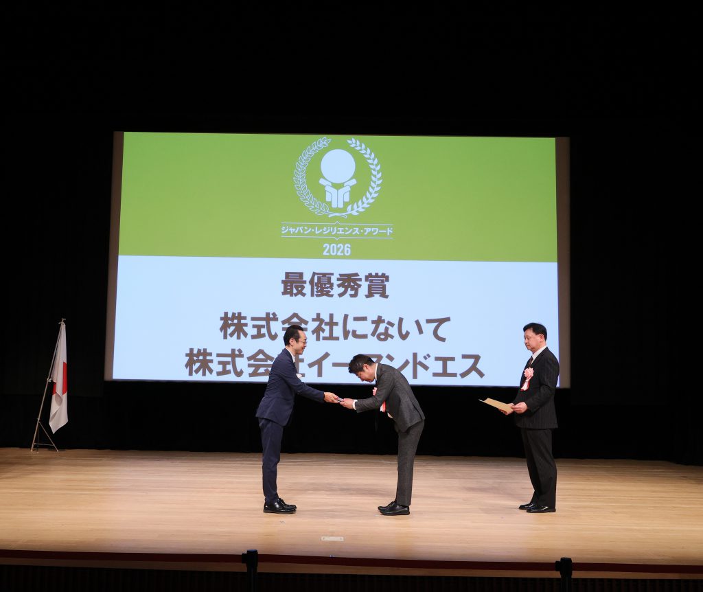 2026年4月21日-株式会社イーアンドエス・株式会社にないては、共同プロジェクトの「観光立国と国土強靭化を両立する“JapanSafeNet”構築プロジェクト」が、一般社団法人レジリエンスジャパン推進協議会が主催する「第12回レジリエンスアワード(強靭化大賞)」において「最優秀賞」を共同受賞し、同日に表彰状が授与されました。