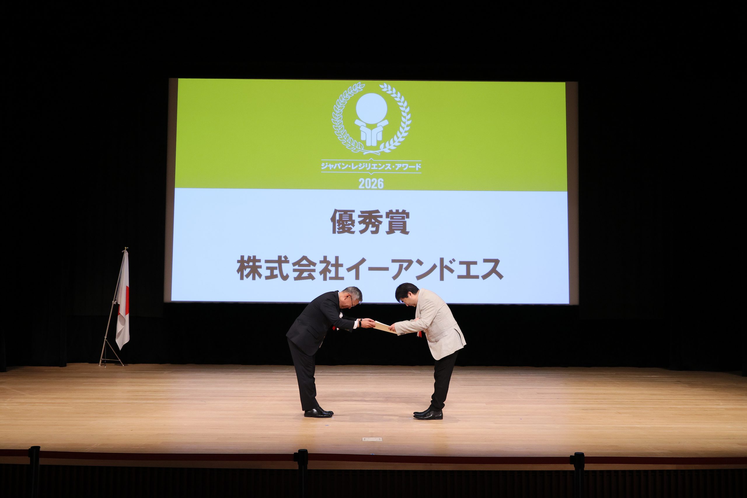 2026年4月21日-株式会社イーアンドエスは、「世界で初で日本発のAIを用いた硬度圧縮技術による次世代通信インフラ“K5 RADIO”」が、一般社団法人レジリエンスジャパン推進協議会が主催する「第12回レジリエンスアワード(強靭化大賞)」において「優秀賞」を受賞し、同日に表彰状が授与されました。